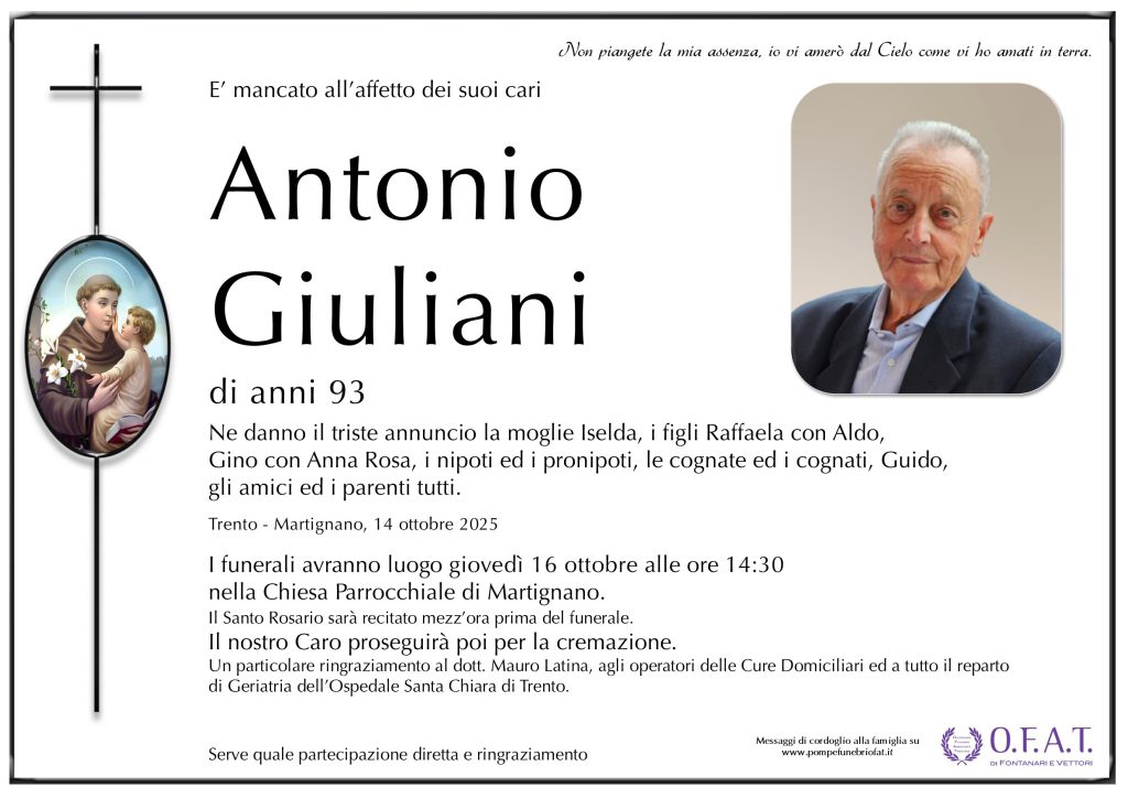 I funerali avranno luogo giovedì 16 ottobre alle ore 14:30 nella Chiesa Parrocchiale di Martignano.
