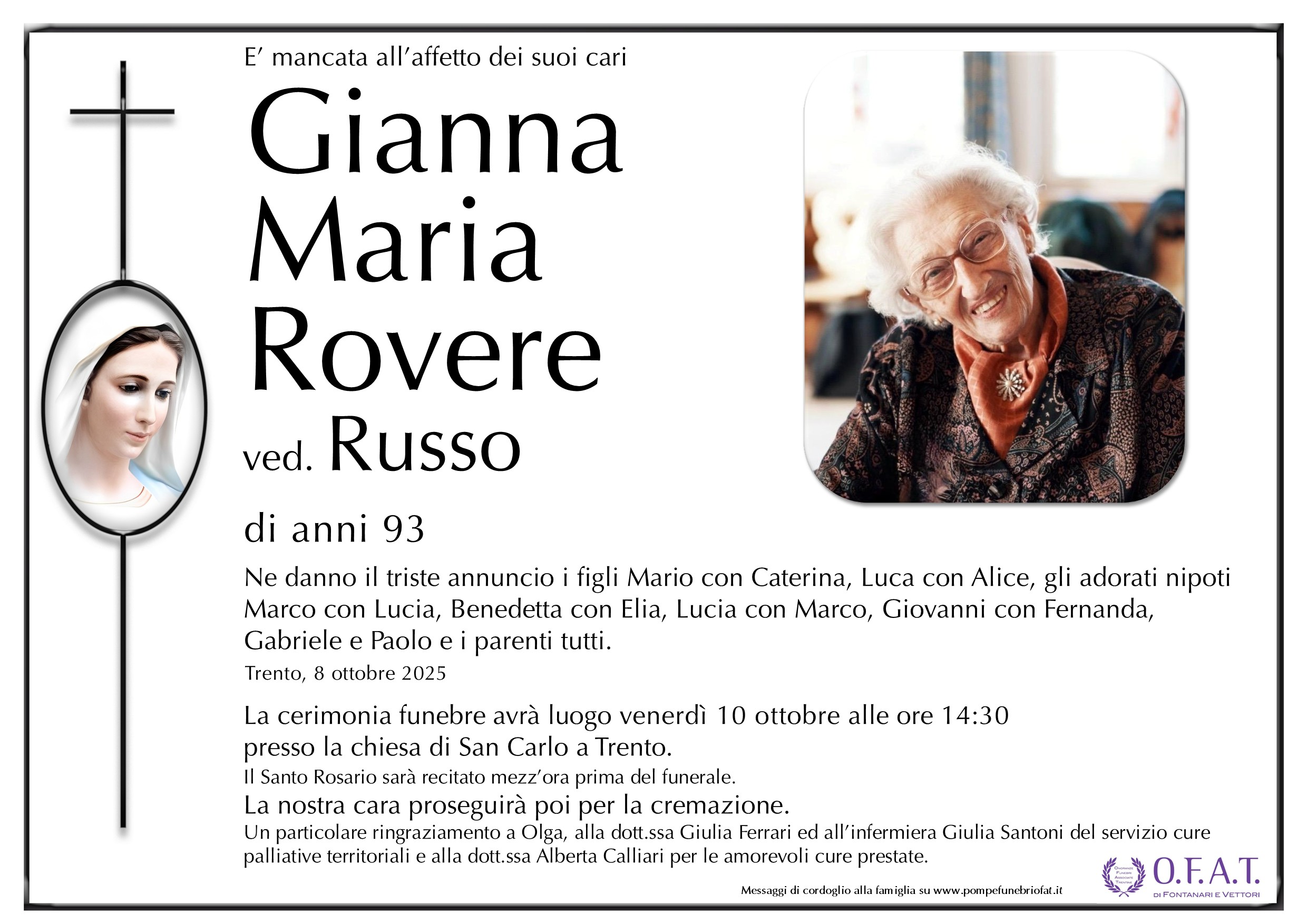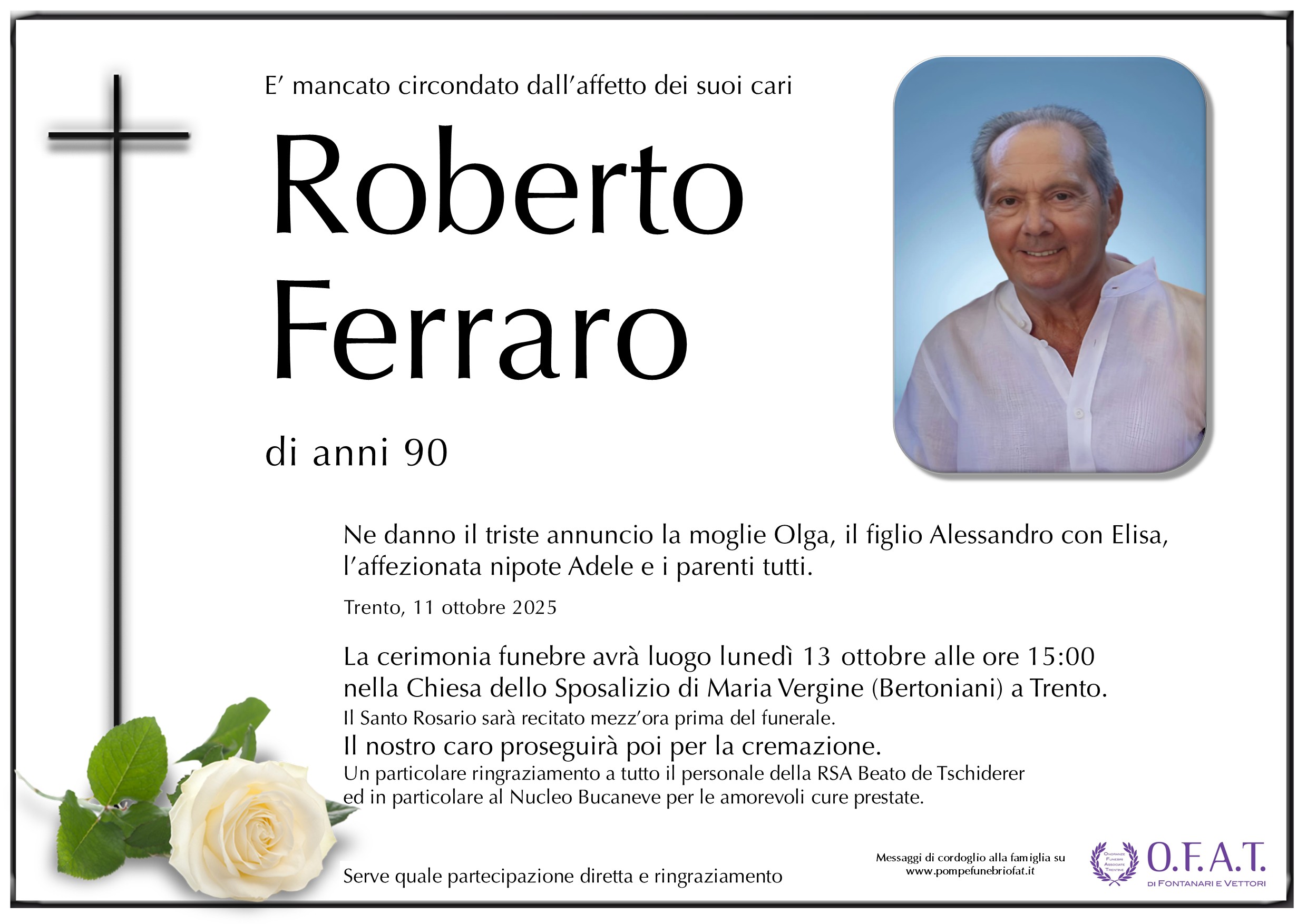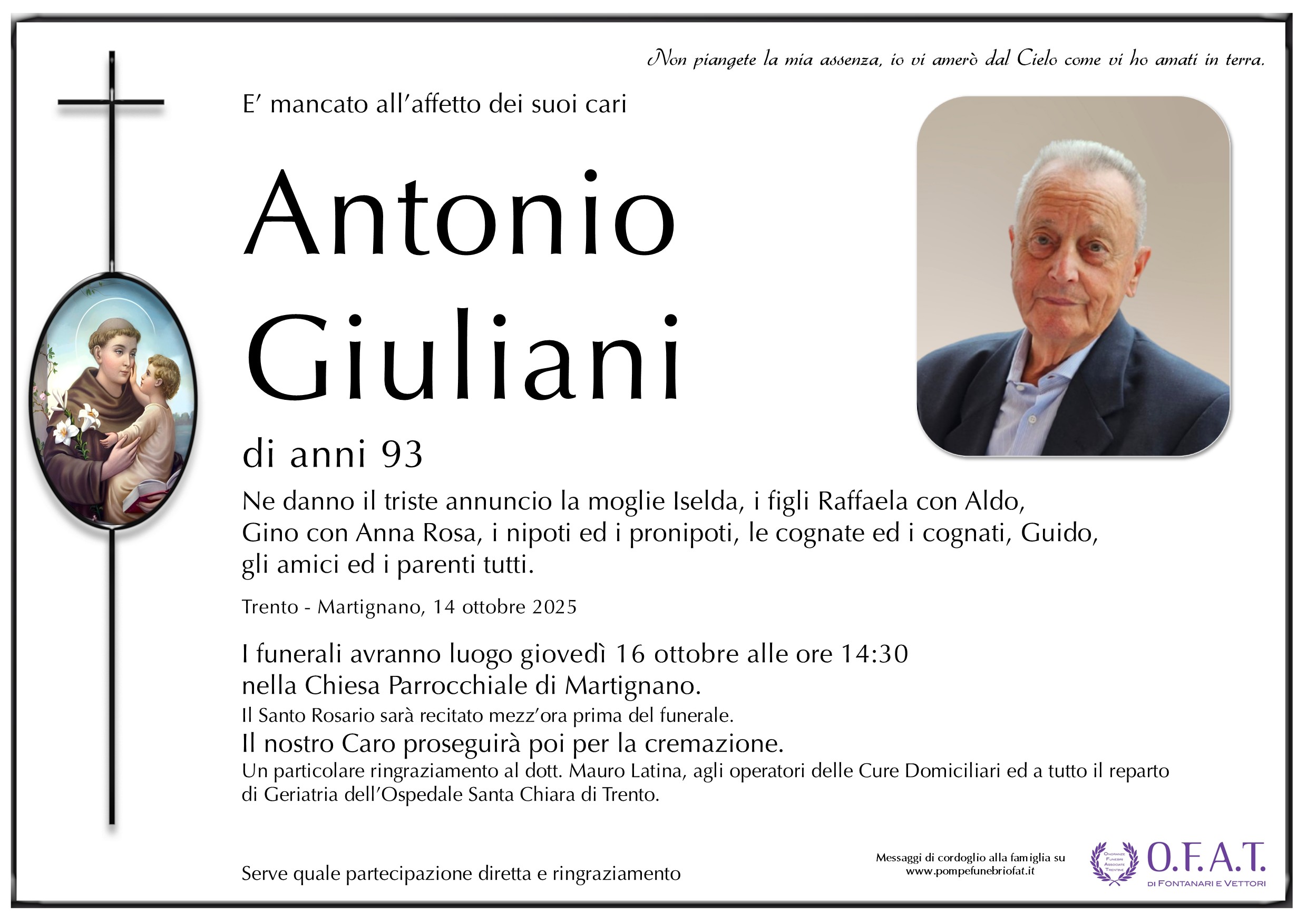 I funerali avranno luogo giovedì 16 ottobre alle ore 14:30 nella Chiesa Parrocchiale di Martignano.