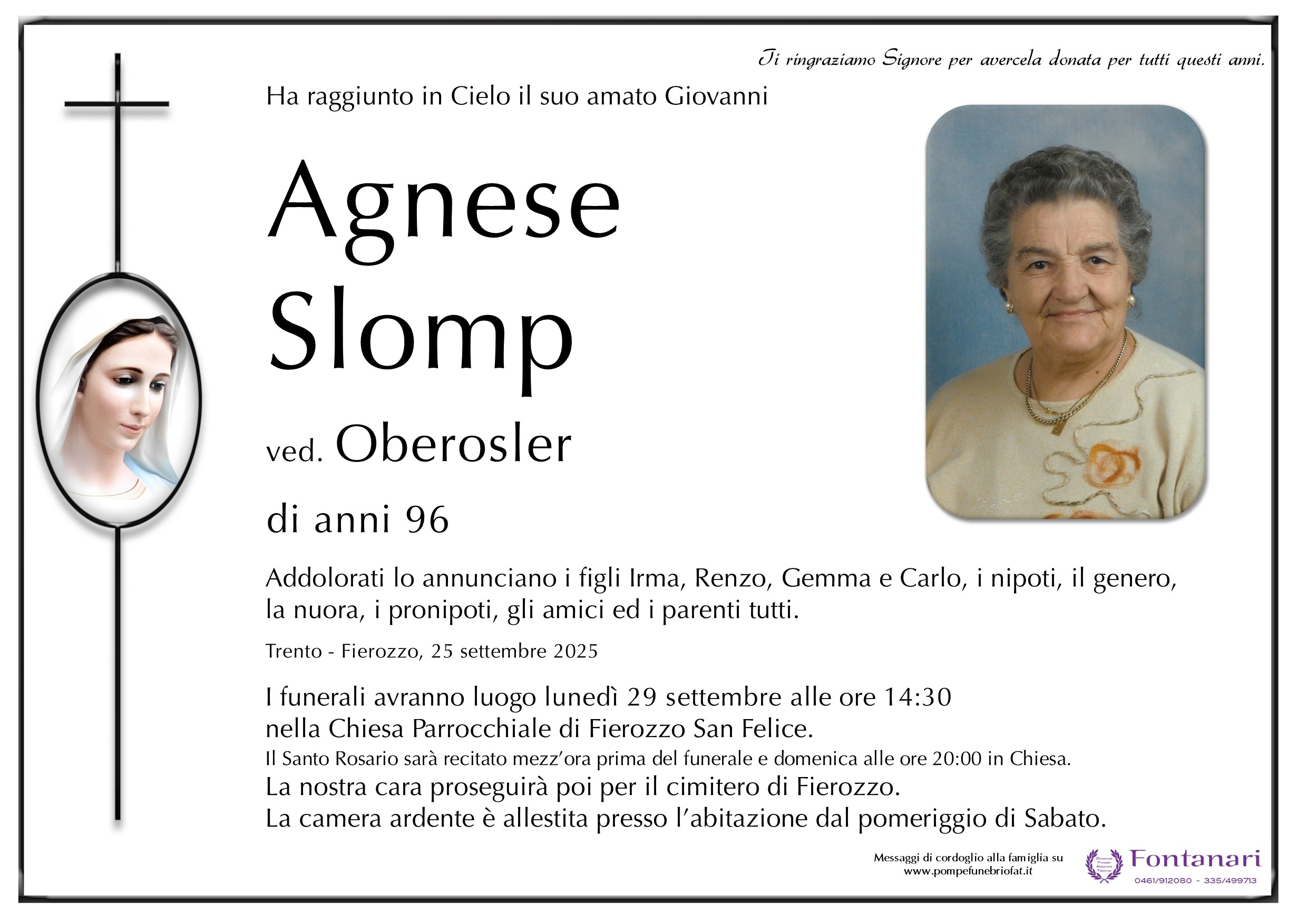 I funerali avranno luogo lunedì 29 settembre alle ore 14:30 nella Chiesa Parrocchiale di Fierozzo San Felice.