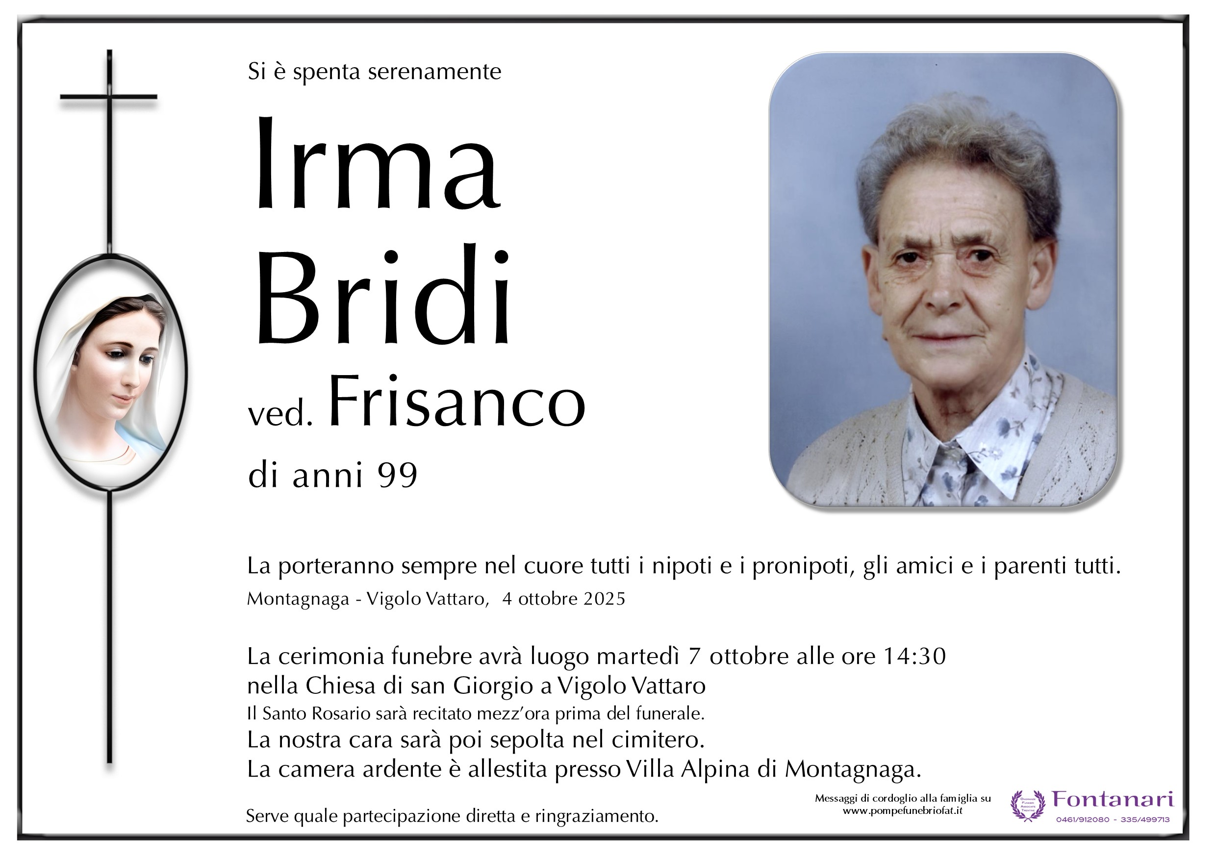 La cerimonia funebre avrà luogo martedì 7 ottobre alle ore 14:30 nella Chiesa di san Giorgio a Vigolo Vattaro